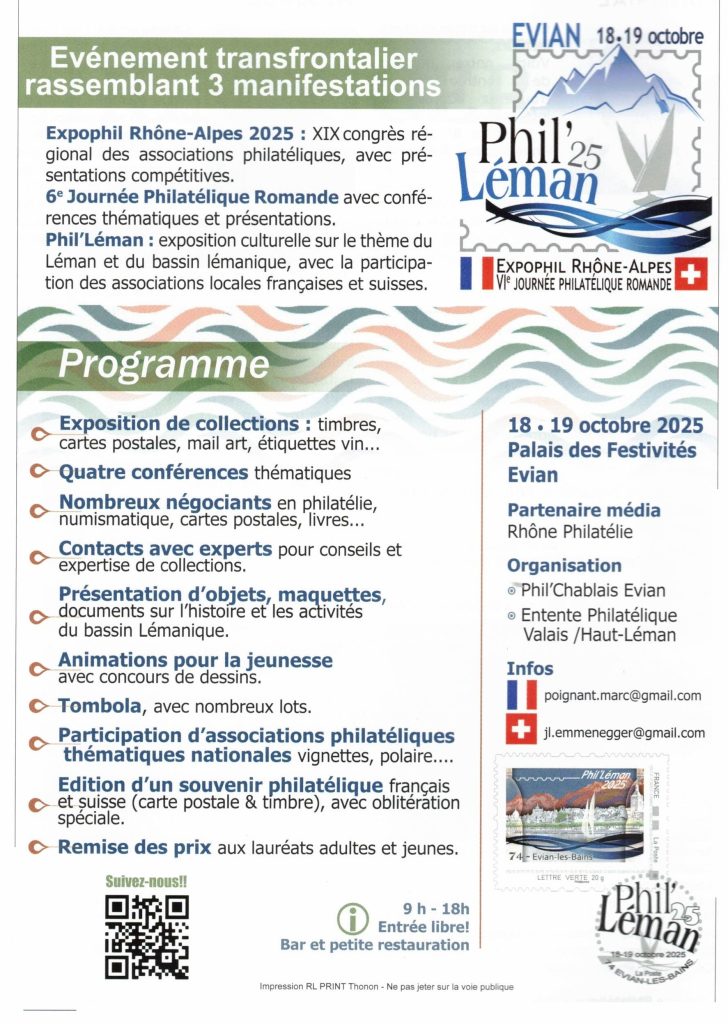 ORGANISATEURS: Phil’Chablais Club Philatélique d’Évian et Thonon, la Fédération Française de Philatélie et l’Entente Philatélique Valais/Haut-Léman Suisse